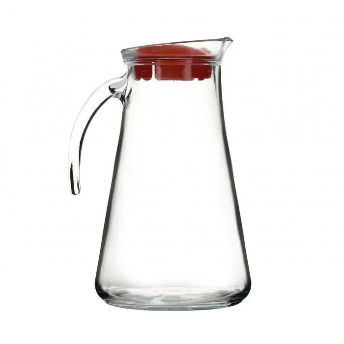 Стеклянный графин Red Kosem с красной крышкой, объём 1000 мл (арт. 80051). Удобный и стильный аксессуар для подачи воды, сока и других напитков.