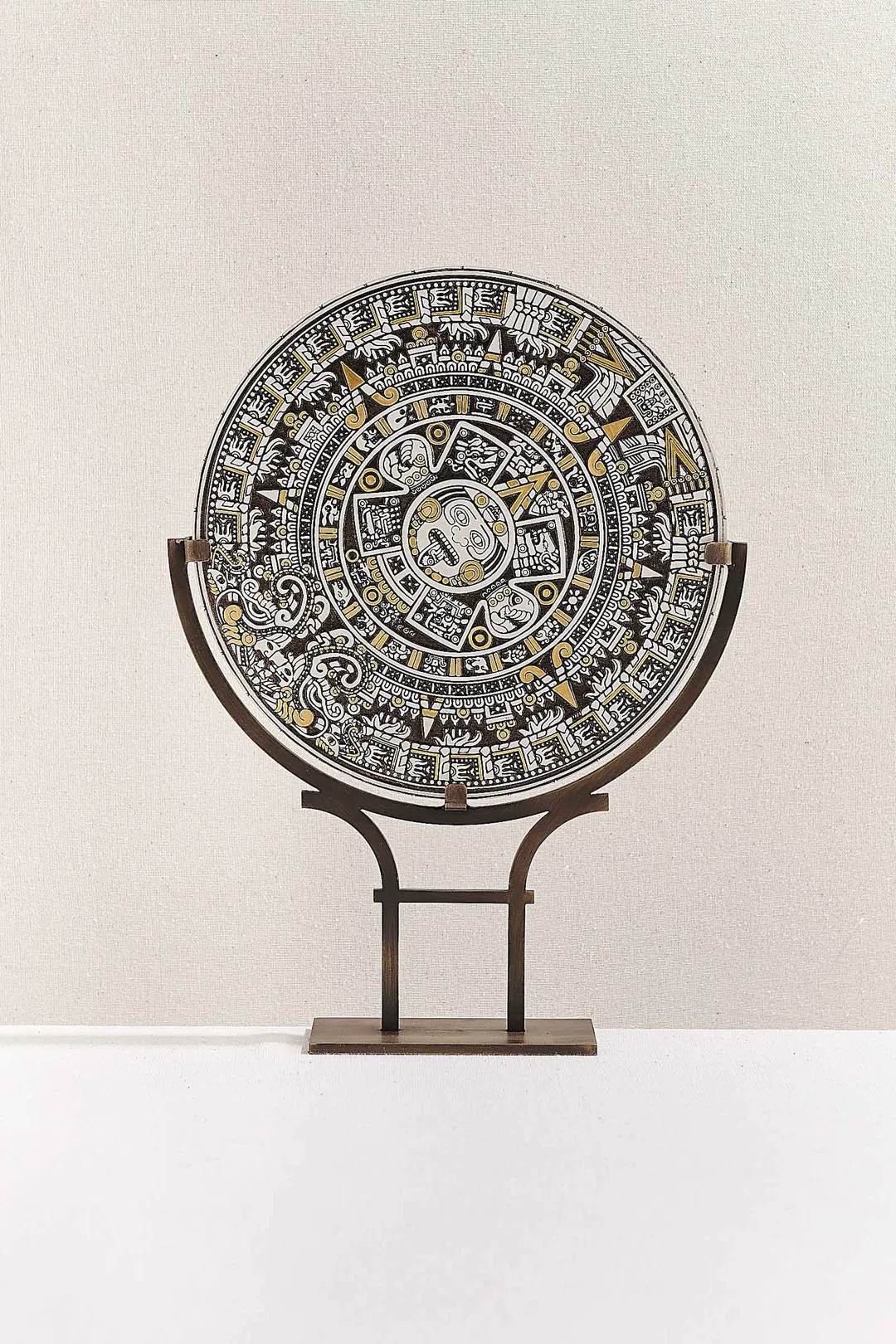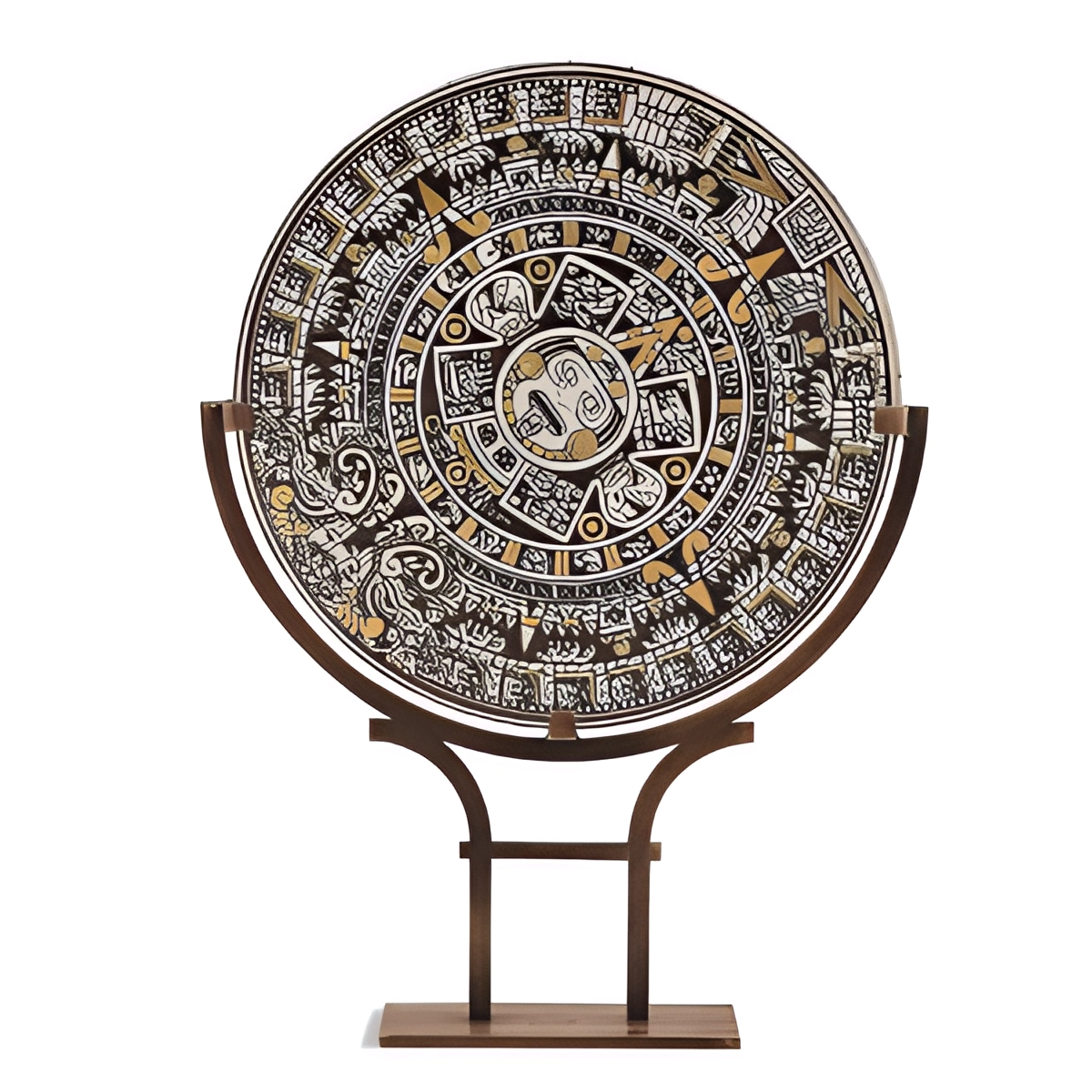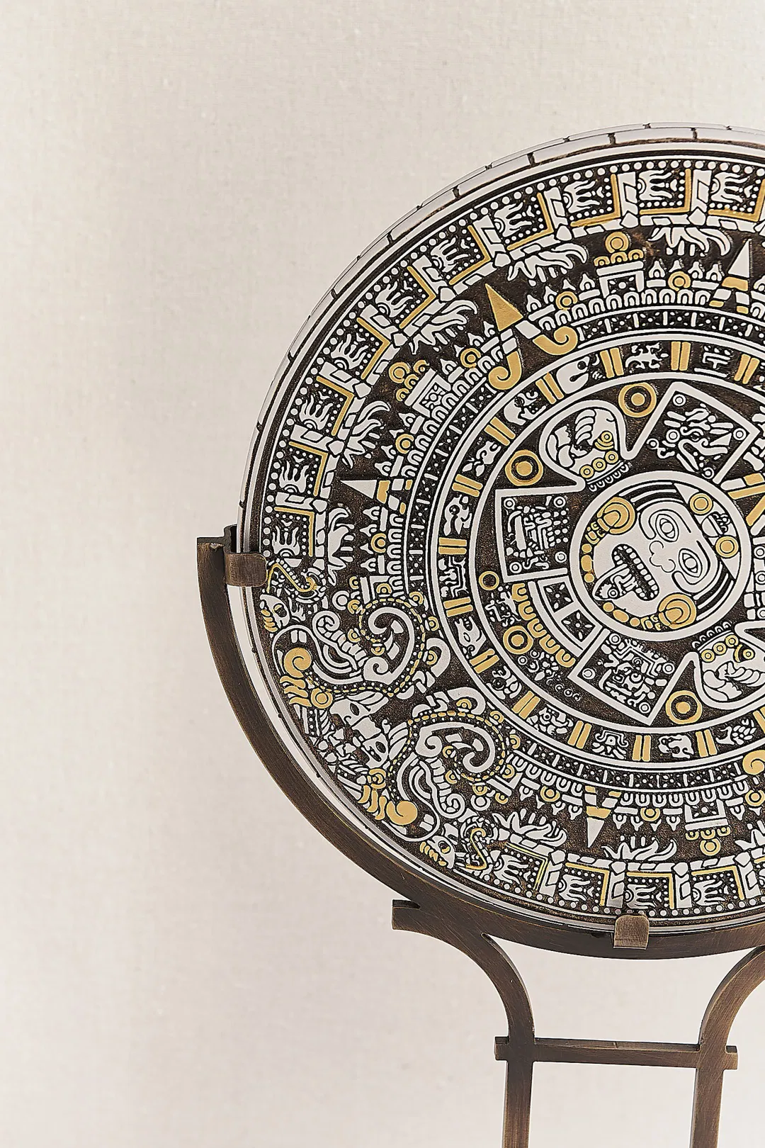 ВНЕ ВРЕМЕНИ Время определяется как течение времени, в течение которого все объекты во Вселенной меняют своё относительное положение в процессе движения. В общественной жизни тема времени и его измерения имела большое значение с древних времён. Древние люди определяли время и его направление, в основном, наблюдая за солнцем. Более того, основополагающей центральной концепцией во взаимоотношениях времени и общества было измерение времени. Концепция времени была ключевой областью интереса философии на протяжении всей истории, а также важной областью изучения математики и физики. Тема времени и пространства – это тема, которая на протяжении всей истории обсуждалась в области веры, философии и науки, с различными точками зрения на понимание Вселенной. Для понимания времени было разработано множество методов измерения. Солнечный камень: Согласно представлениям ацтеков, все события, затрагивающие человечество, делились на четыре эпохи и «Солнце». Ацтеки определяли своё время как последнюю из пяти эпох, считая её «Пятой солнечной эпохой». Они верили, что четыре предыдущие эпохи завершились естественными причинами, такими как потоп или катастрофы, вызванные войнами между богами. Символы, окружающие центральную панель Великого ацтекского календарного камня, и изображение в его центре стали предметом многочисленных исследований. Первое внутреннее кольцо изображает двадцать знаков, соответствующих двадцати дням ацтекского месяца. Четыре панели, окружающие центральную грань, считаются глифами, представляющими четыре прошедшие эпохи и катаклизмы «воды, ветра, землетрясений, штормов и ягуаров», которые их завершили. Камень Солнца был вдохновлён мотивами Камня Солнца, обнаруженного во время раскопок в Мексике в 1790 году. Сегодня камень, выставленный в Национальном музее антропологии Мексики, изображает в центре лицо ацтекского бога Солнца Тонайута. Все рельефные узоры на Каменном Солнце выполнены вручную с использованием позолоты и античных красок.